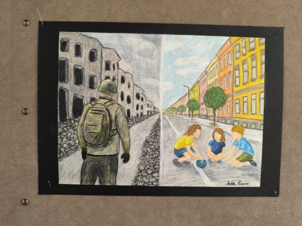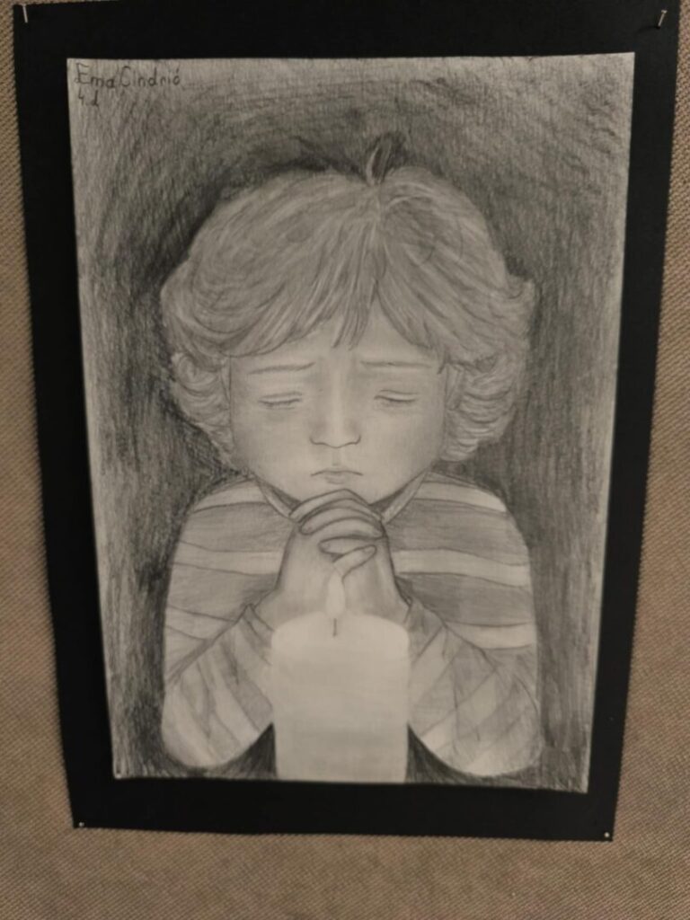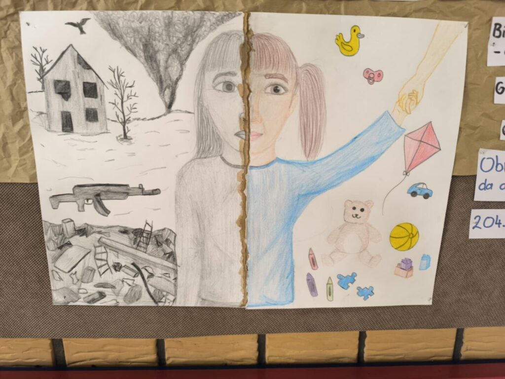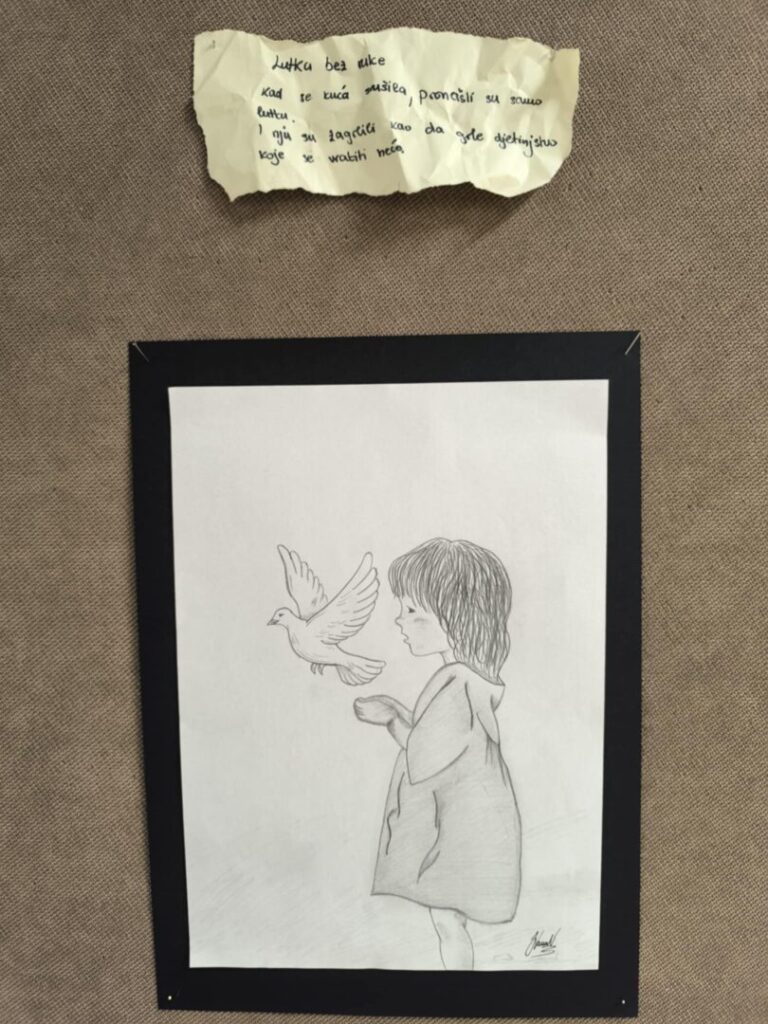Učenici su likovnim radovima prikazali prizore prekinutog djetinjstva, a uz svaku ilustraciju nalaze se i kratke, dojmljive rečenice koje posjetitelja uvode u osobne, tihe priče djece uhvaćene u vihor rata. Jednostavne poruke, nastale iz promišljanja učenika, dočaravaju prostore u kojima je umjesto igre zavladala tišina, strah i gubitak.