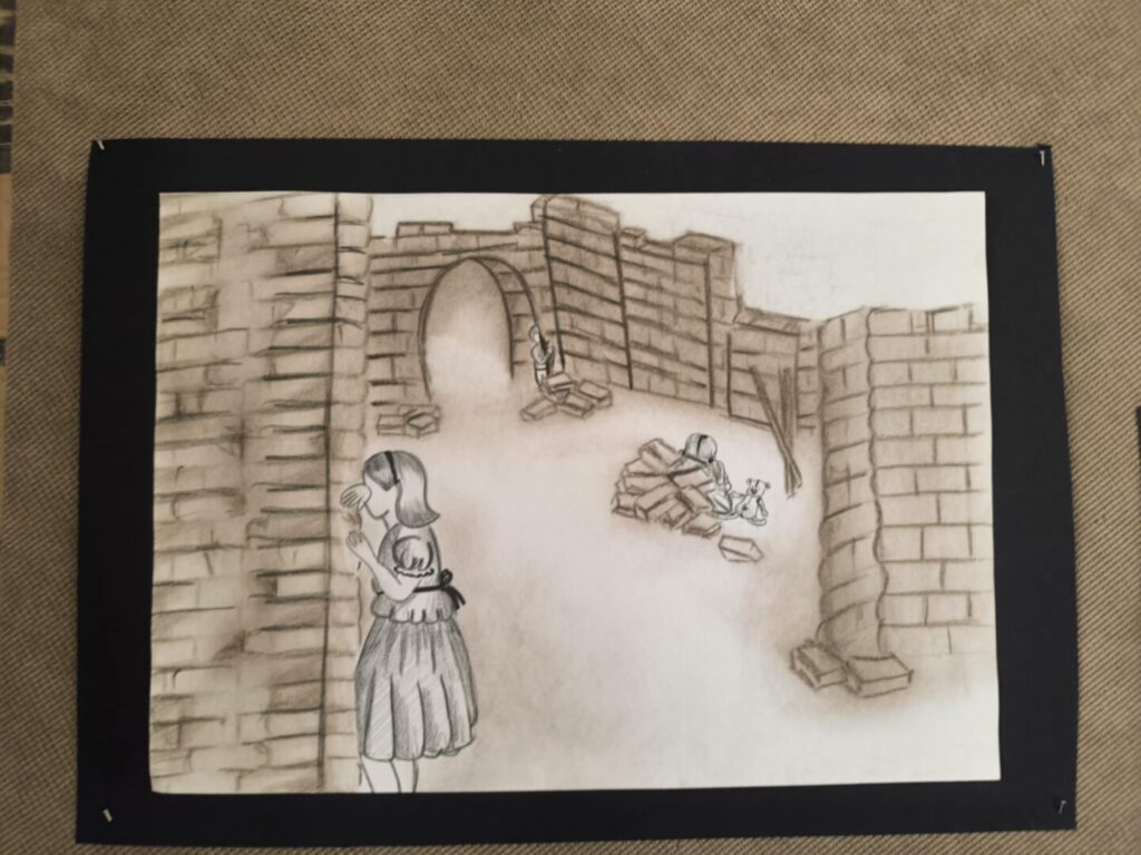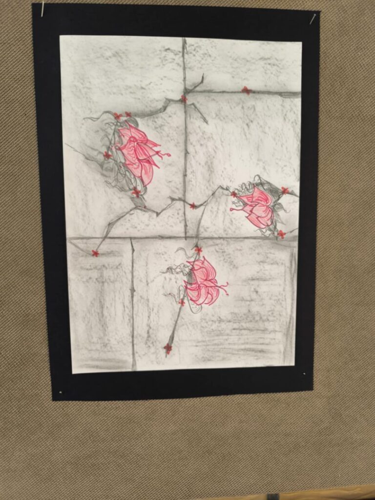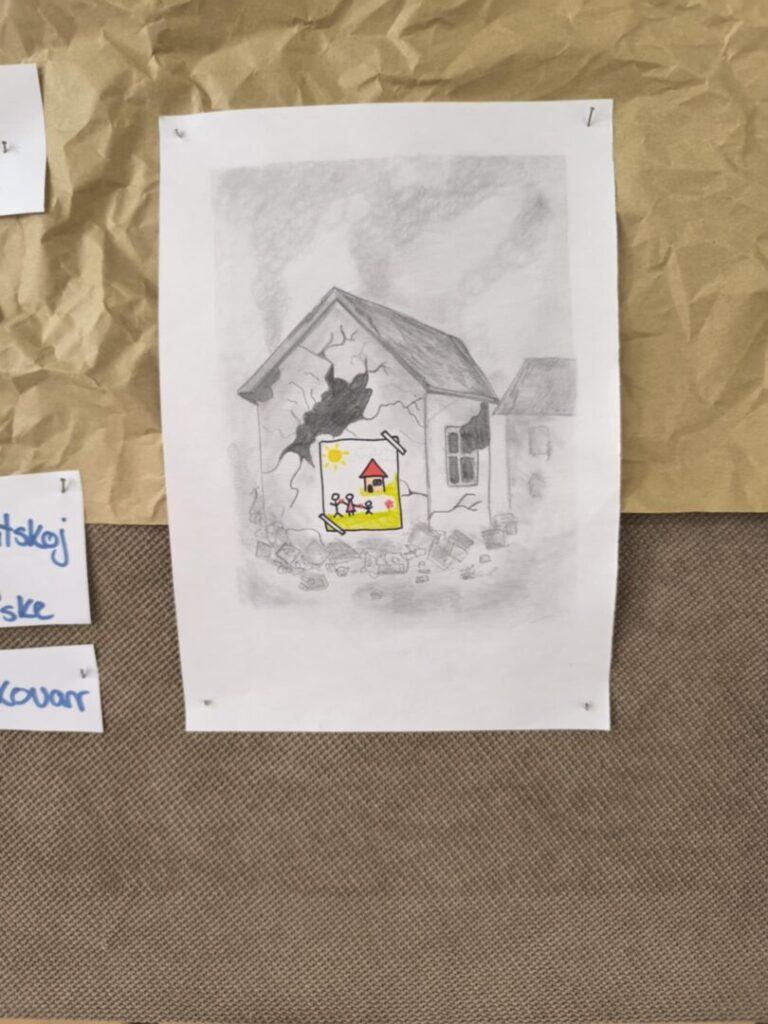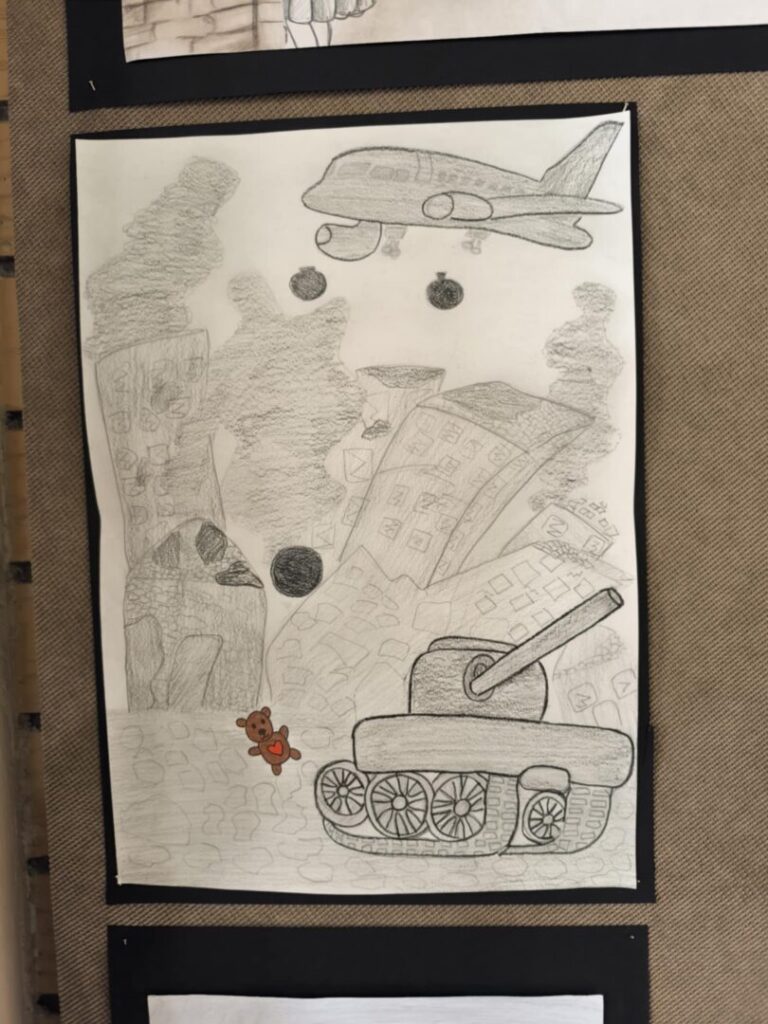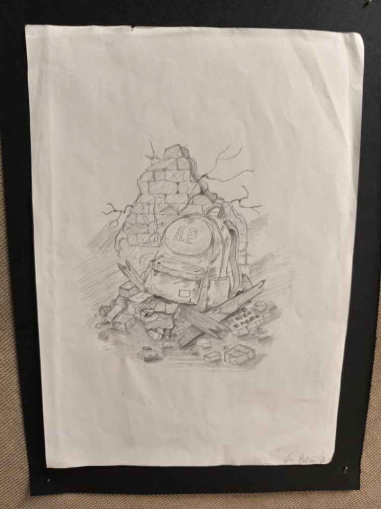 Učenici su likovnim radovima prikazali prizore prekinutog djetinjstva, a uz svaku ilustraciju nalaze se i kratke, dojmljive rečenice koje posjetitelja uvode u osobne, tihe priče djece uhvaćene u vihor rata. Jednostavne poruke, nastale iz promišljanja učenika, dočaravaju prostore u kojima je umjesto igre zavladala tišina, strah i gubitak.