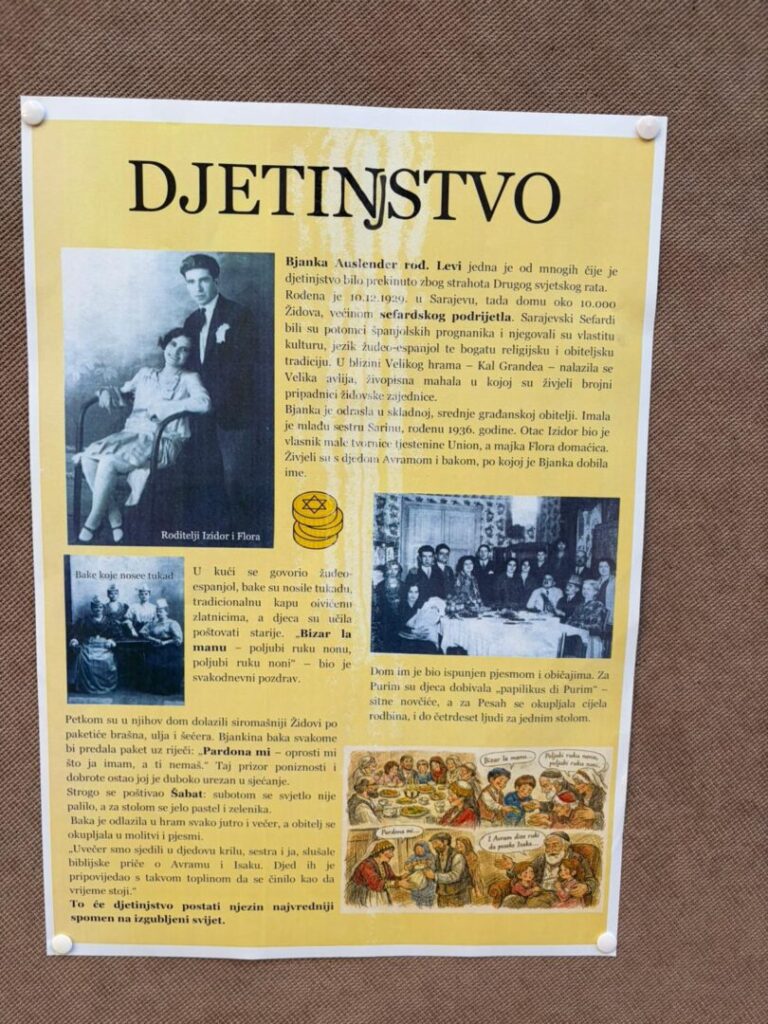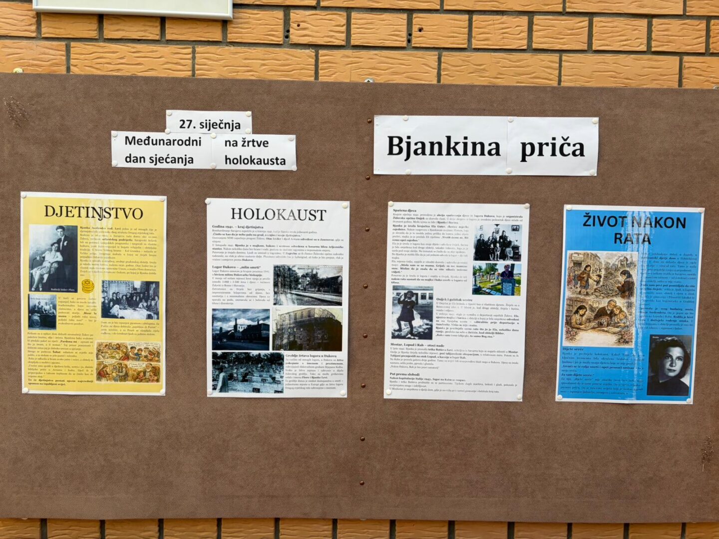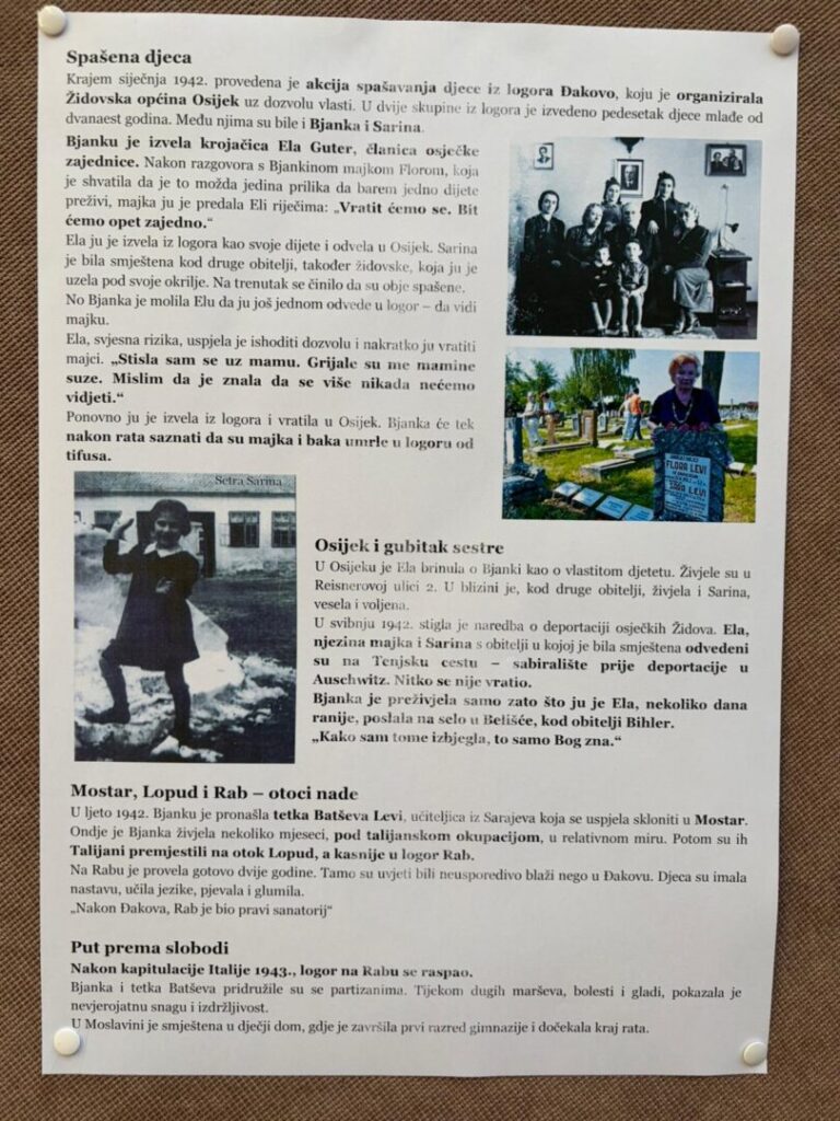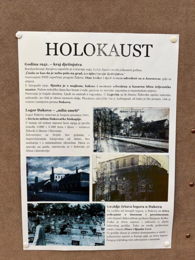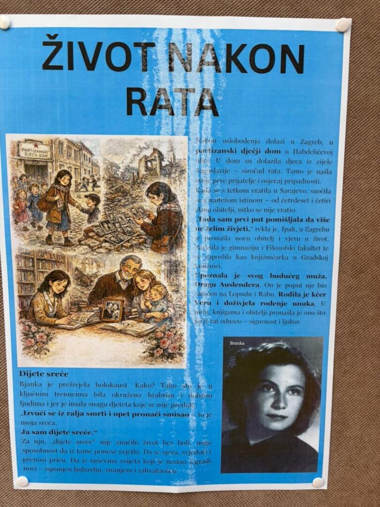 Povodom Međunarodnog dana sjećanja na žrtve Holokausta, u našoj je školi postavljena mala tematska izložba posvećena Bjanki Auslender, rođenoj Levi, preživjeloj iz logora Đakovo. Izložba je dio edukativnog projekta „Bjankina priča – sjećanje koje nas uči“, kojim se učenike potiče na razumijevanje povijesnih događaja kroz osobne sudbine.