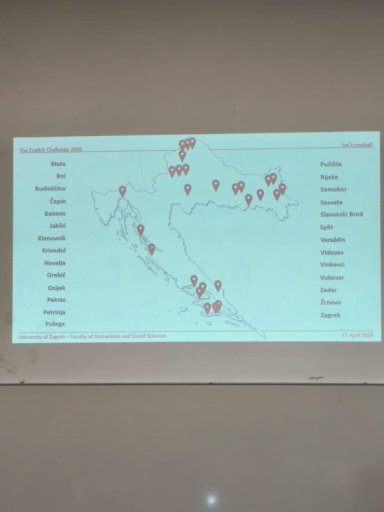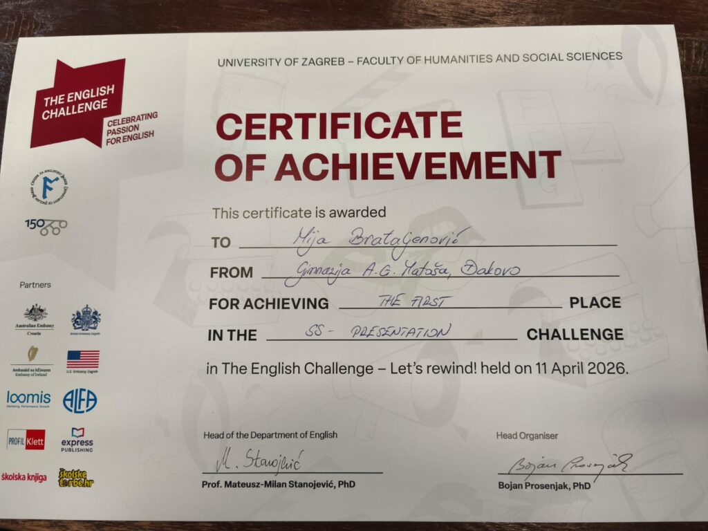 U subotu, 11. travnja 2026., dvije učenice naše škole, Mija Brataljenović (3.a) i Stela Brandis (3.b), sudjelovale su na Festivalu engleskog jezika The English Challenge, koji se održao u organizaciji Filozofskog fakulteta u Zagrebu. Osim što su se pritom odlično provele, upoznale brojne zanimljive sudionike i stekle nova iskustva, naše su učenice ostvarile i zapažene rezultate.